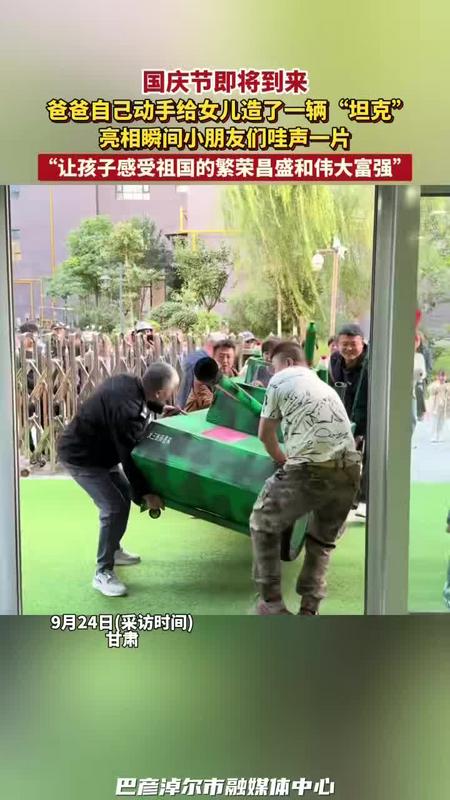 国庆节即将到来,爸爸自己动手给女儿造了一辆“坦克”,亮相瞬间小朋友们哇声一片,“让孩子感受祖国的繁荣昌盛和伟大富强”