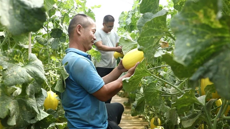 近日,五原县隆兴昌镇金伯利农场五原示范区种植的特色蜜瓜迎来了大丰收,一颗颗金色的蜜瓜香味浓郁,长势喜人。荣誉村九组村民牛存山和同村村民忙着采摘成熟的蜜瓜,他向笔者介绍说:“我常年在金伯利打工,这两天主要是采摘蜜瓜,一天差不多能挣180多元,一年差不多能收入2万来块钱。”