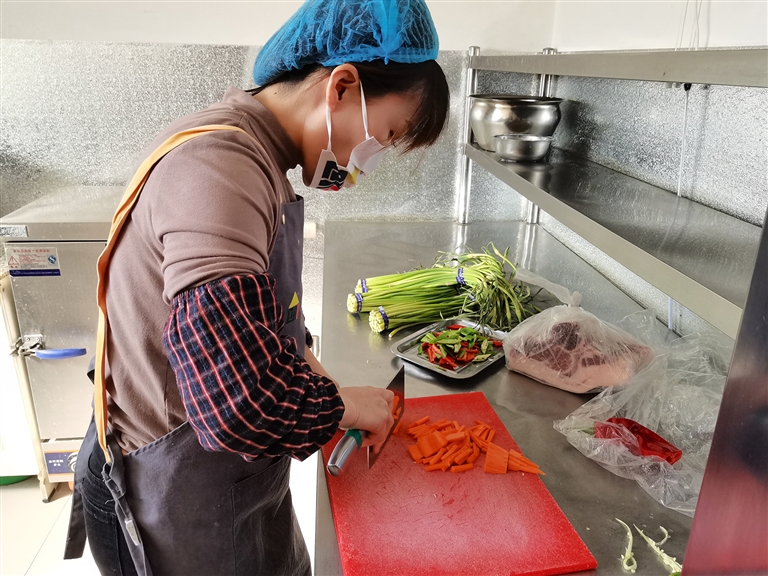 还不到10点,市实验小学附近的锦林花园小区内,“创一优托”的学生餐厅已经忙碌起来。两位做饭阿姨开始准备午饭了,正在切蒜薹的赵阿姨说:“我们今天中午做肉炒蒜薹、溜肉段、鱼香土豆丝和香菇油菜。菜品是前一天就定好的,机构老师会提前订当天的新鲜蔬菜。午餐的标准是两荤两素,晚上有可能吃包子、炖肉或面条。”