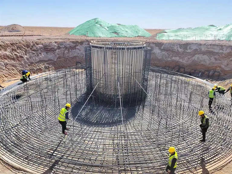 工人们正在进行风机基础钢筋绑扎(4月16日摄)。截至目前,蒙电综能甘其毛都镇100兆瓦风电项目风机基础浇筑及安装工程已完成9基,集电线路基础累计完成74基,已立塔架16基,升压站土建工程完成80%,整个项目正稳步推进,争取5月30日前实现全容量并网发电。项目全部建成投产后,年发电量可达3.25亿千瓦时。