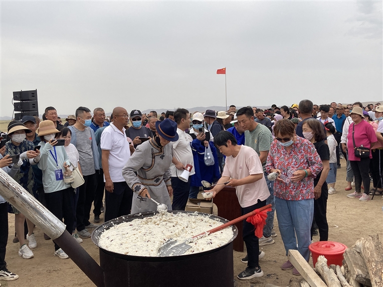 “有没有外地来的客人?喝一碗‘阿木苏’。”揭开锅盖肉香四溢,热情好客的牧民设席,架起大锅,煮熟100斤大米和20斤“珍珠”,加入酸奶、黄油、白油、葡萄干、红枣、红糖等多种原料,熬制4个多小时,用草原上的美食“阿木苏”款待八方来客。
