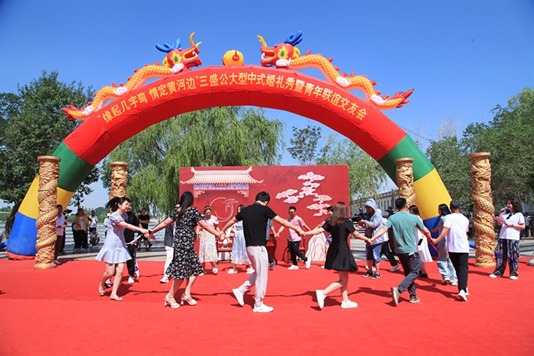 7月的磴口,连空气中都是甜蜜的气味。7月19日8时,在黄河三盛公国家水利风景区喷泉广场上,红地毯、红丝绸承载着浪漫的气息,一场夏日里的甜蜜邂逅正在上演,“缘起几字弯 情定黄河边”三盛公大型中式婚礼秀暨青年联谊交友会在这里浪漫举行。