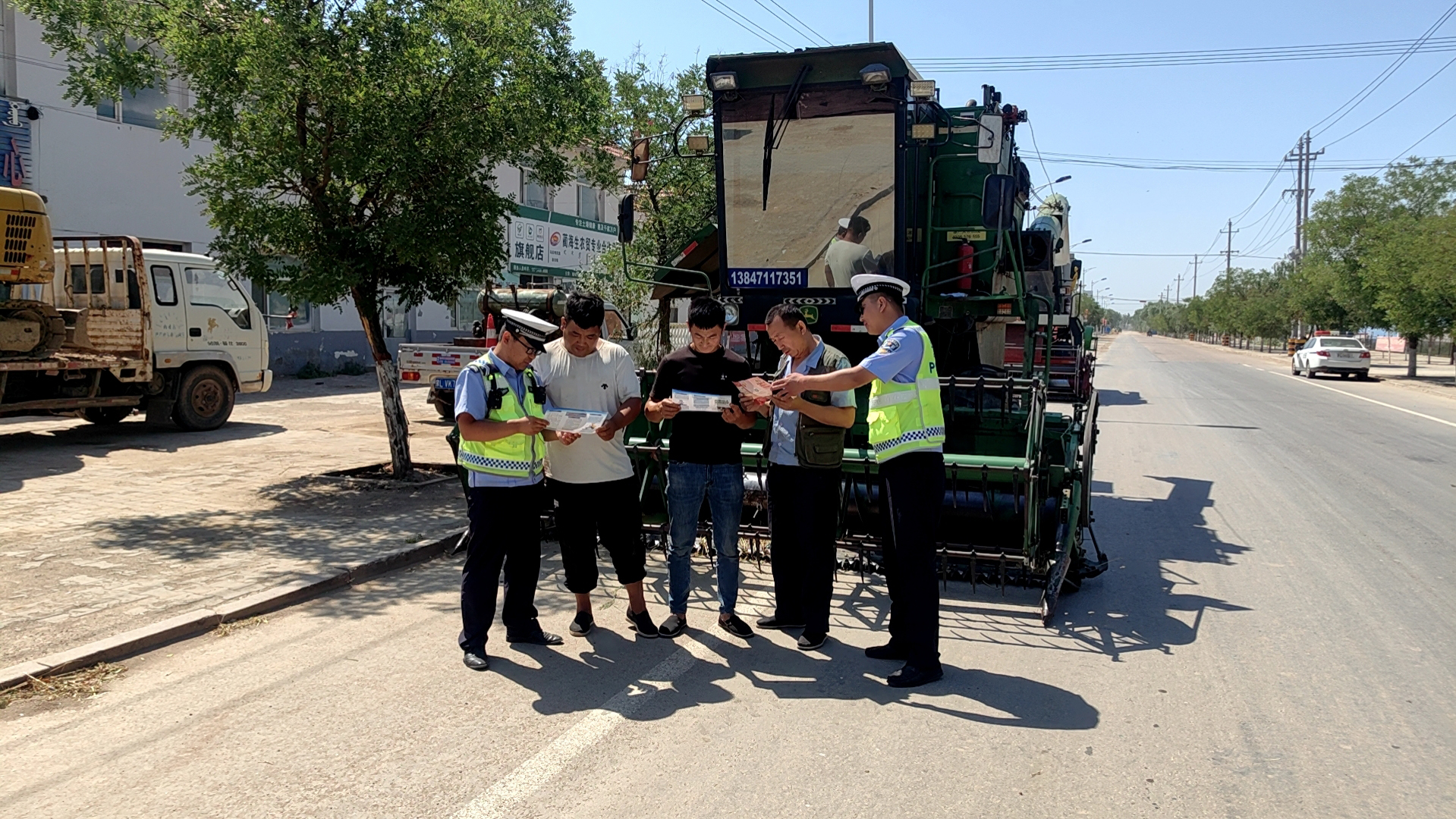 近日,乌拉特前旗交管大队为跨区域收割小麦的联合收割机驾驶人提供指示、指路、联系农户、引导进入农田作业等服务,为他们开辟“绿色通道”,并开展交通安全知识宣传,受到收割机驾驶人赞誉。