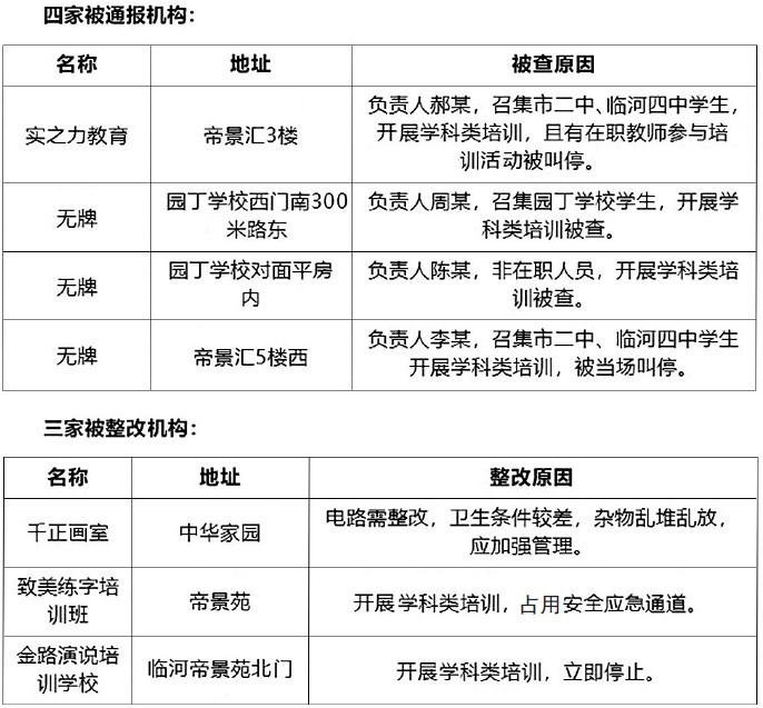 根据教育部办公厅等十二部门联合印发的《关于进一步加强学科类隐形变异培训防范治理工作的意见》(以下简称《意见》)和《关于开展校外培训“监管护苗”2023年暑期专项行动的通知》〔内教监管函(2023)78号〕文件精神,按照“发现一起、查处一起”的原则,暑假期间,巴彦淖尔市教育局、临河区教育局联合临河区市场监管局、城市管理综合执法局等部门开展专项排查,共排查校外培训机构112家,涉及隐形变异违规培训问题7家,并将违规培训案例进行通报。