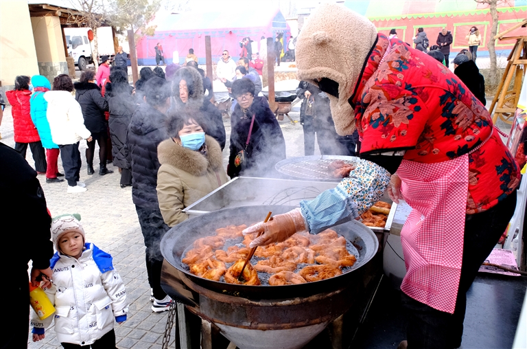 当天上午,五原县河套农耕文化博览园内蒙古民富旅游文化有限公司园区内民俗文化街区人头攒动,来自各地的网红在直播年猪节盛况,4口直径1米的大锅和2口稍小的锅里正在翻炒着年猪肉,引得游客闻香驻足。大厨说:“今天6口锅烩了400斤猪肉、200斤酸菜、200斤土豆,大概够600人吃。”