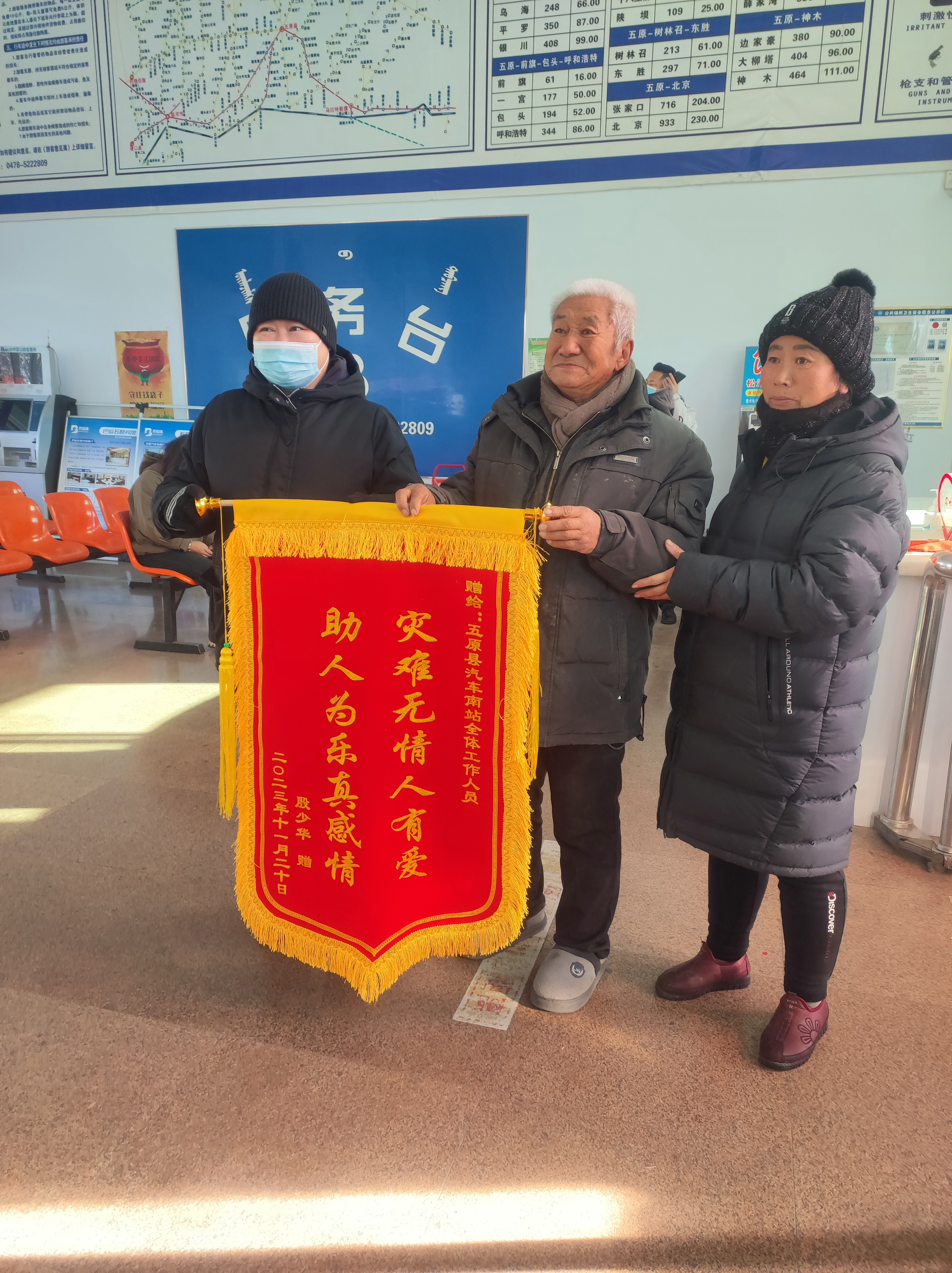 20分钟后,老人的女儿、外孙来接他回家,老人起身向在场值班人员深深鞠了一躬。之后,老人和家人又送来一面写有“灾难无情人有爱 助人为乐真感情”的锦旗,再次对五原汽车站工作人员表示感谢。