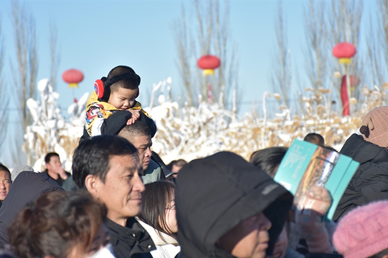 乌梁素海景区内游人如织,晶莹剔透的冰雕、栩栩如生的雪雕与百面威风锣鼓交相辉映,为喜迎“十四冬”营造浓厚氛围。