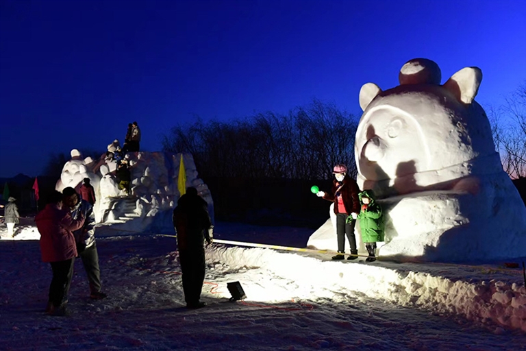 猜灯谜、做游戏、在冰雪长城上穿梭、看歌舞、品美食、与大型雪雕合影……游客玩得不亦乐乎,处处洋溢着节日的欢乐。