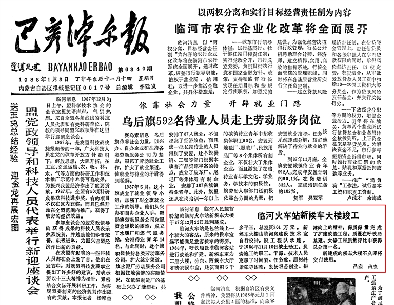 1988年1月8日,《巴彦淖尔报》刊登报道《临河火车站新候车大楼竣工》