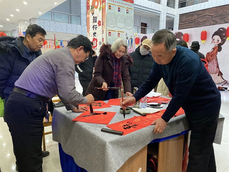 红色纸张徐徐展开,秀美字迹跃然纸上,书法家们挥毫泼墨,大展身手,写下诚挚的新春祝福。“新年更有新气象 龙年抖擞龙精神”“龙腾九域七星照 福到家门万户春”……一幅幅寓意美好的春联,传递着龙年的美好祝福,浓浓的年味儿扑面而来。