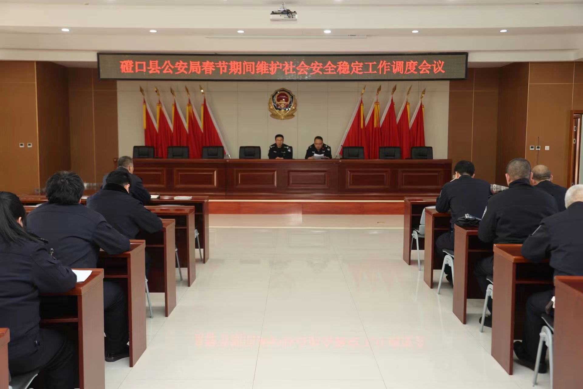 为进一步做好春节期间安保维稳工作,确保全县人民度过一个欢乐喜庆祥和的新春佳节,2月6日,磴口县公安局召开春节期间维护社会安全稳定工作调度会,第一时间传达市公安局对春节期间维护社会安全稳定工作要求,安排部署贯彻落实工作。县局党委副书记、政委高慧卿、在家党委班子成员以及局属各部门负责人、机关、城区各部门全体民辅警参加会议。