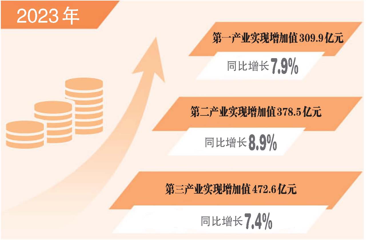 其中,第一产业实现增加值309.9亿元,同比增长7.9%;第二产业实现增加值378.5亿元,同比增长8.9%;第三产业实现增加值472.6亿元,同比增长7.4%。