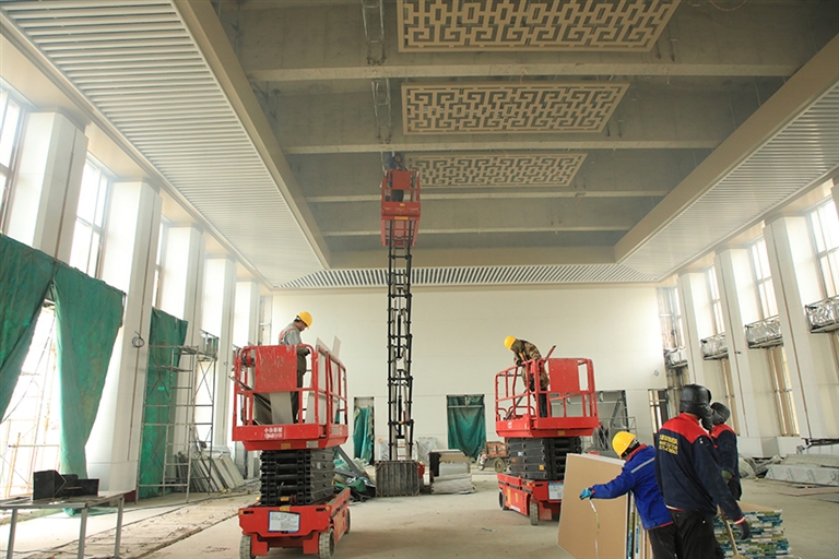 在项目施工现场笔者看到,十几名工人正在进行室内屋面吊顶安装。自复工以来,项目部组织进行人员岗前安全培训,针对施工现场进行全面安全排查,细化施工任务,具体责任到人,投入机械设备10余台套,动员工人们铆足干劲,火速进入工作状态。目前,项目全面转入室内装修及机电安装阶段,已完成单位工程85%。