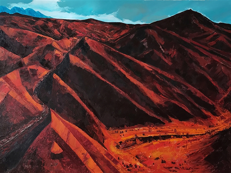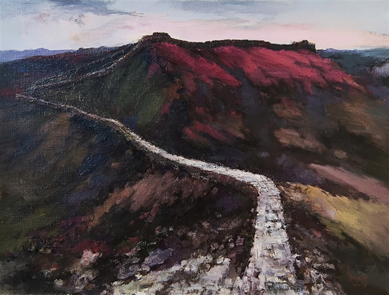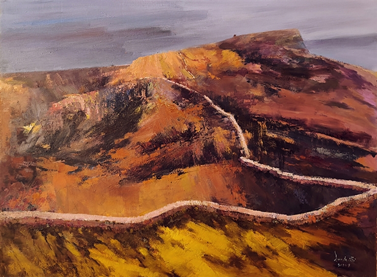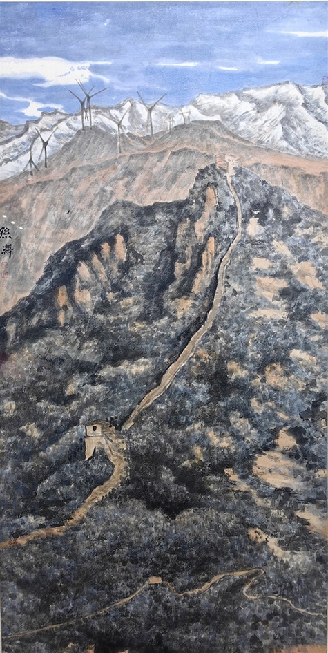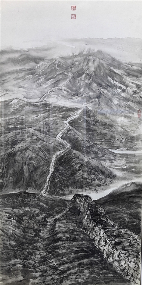 巴彦淖尔境内有赵长城、秦长城、汉长城等长城遗迹1007公里。长城深受巴彦淖尔艺术家的喜爱,他们挖掘长城文化深刻内涵,把各自对长城的理解和创思通过手中的画笔充分体现出来。作品体现了长城磅礴的气势和悠久的历史,也表达了作者对祖国河山的热爱与赞美。作品的构图方式与意境皆悠远开阔,与画面主题以及疏简的笔墨技法相得益彰,让观者领略到浑然天成的笔墨之美与淋漓酣畅的情感表达。