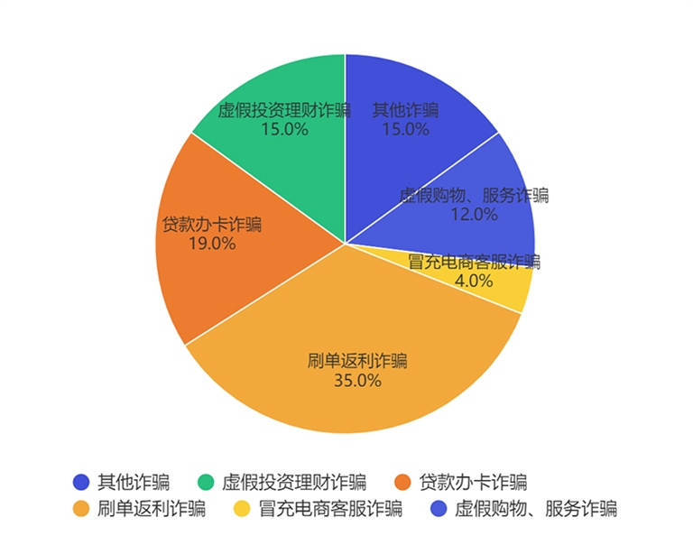 3月31日—4月6日,巴彦淖尔市高发的电信诈骗类型为:刷单返利诈骗,占比35%;贷款办卡诈骗,占比19%;虚假投资理财诈骗,占比15%。