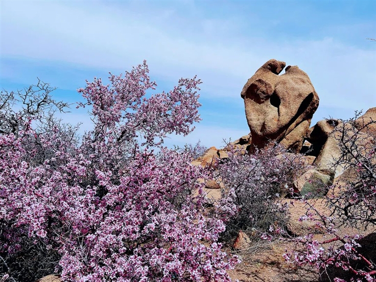 春意盎然的4月,乌拉特中旗风蚀冰臼地质公园里蒙古扁桃花悄然绽放。放眼望去,如霞似锦、绚烂夺目,漫山遍野的扁桃花与独特的地貌相互映衬,勾勒出一幅美丽的画卷,给春日的乌拉特草原增添了一抹绚丽的色彩。