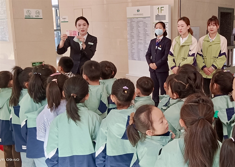 活动中,该行工作人员带领小朋友们参观了营业大厅,向小朋友们介绍了银行卡、社保卡的功能和使用方法,带领小朋友们认识ATM机,了解了人民币相关知识。小朋友们对银行表现出好奇和浓厚的兴趣,纷纷表示要把学到的知识告诉爸爸妈妈。最后,小朋友们为了感谢银行工作人员的辛勤付出,表演了古诗朗诵和舞蹈。他们的表演充满了活力和童趣,赢得了大家的阵阵掌声。