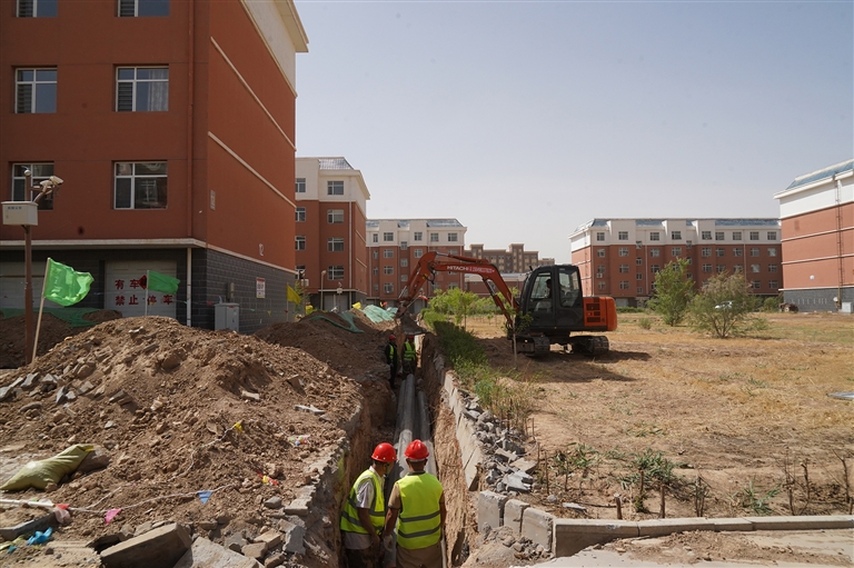 5月15日,在乌拉特后旗地税平房区,工人正在操作挖机进行供暖管网铺设安装工作,并将管网放在沟槽里。随后,工人把高密度聚乙烯外护管包在供暖无缝钢管的接口处,再注入聚氨脂泡沫胶,起到保温和防腐蚀的作用。