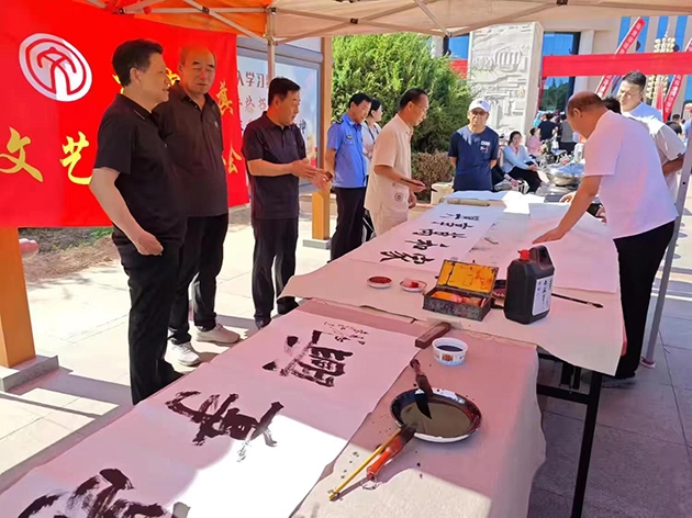 杭锦后旗老年书画协会会员现场挥毫泼墨,书写安全生产标语、警句、格言,警示人们“安全无小事,责任大于天”。书法写作台前挤满了人,“给我写一幅字哇”“给我写幅‘家和万事兴’”……不少人争先恐后地向书画家要字画,书画家有求必应。