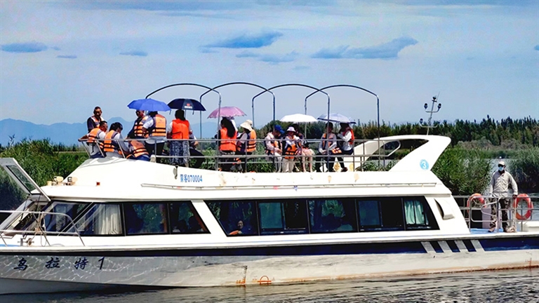游客乘船观赏纳林湖美景