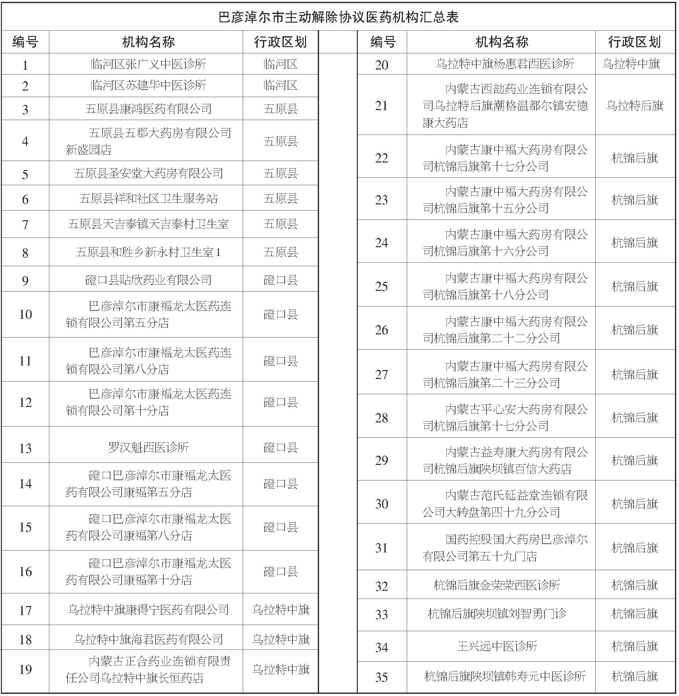 截至目前,巴彦淖尔市有35家定点医药机构主动申请解除医保协议。以下定点医药机构医保协议关系不再存续,医保协议解除后产生的医药费用医疗保障基金不予支付。解除医保协议的35家定点医药机构名单如下: