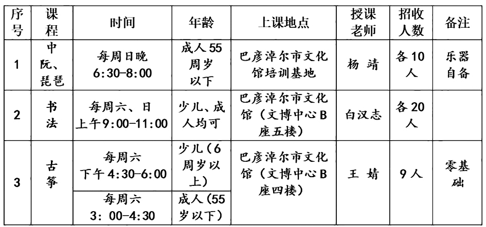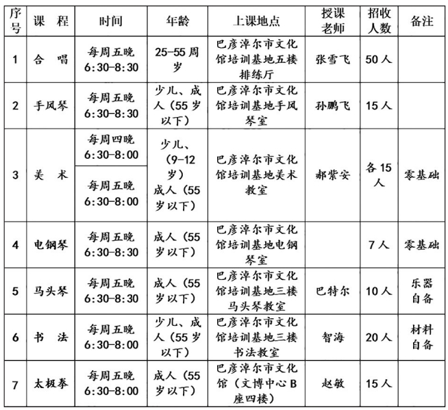 9月20日,记者从巴彦淖尔市文化馆了解到,我市2024年延时开放免费公益培训第二期课程开始报名,最新课程安排新鲜出炉,感兴趣的市民朋友快快报名吧!