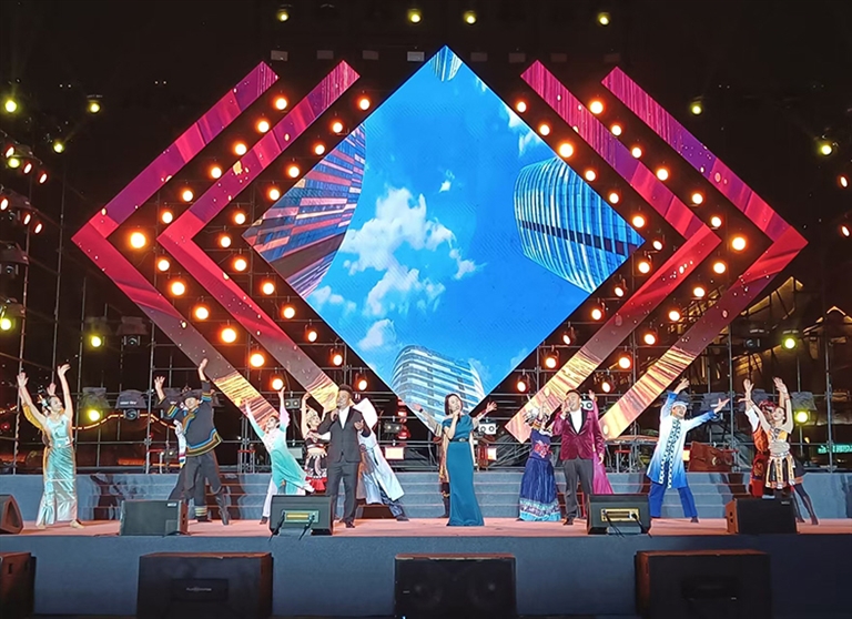 演出在歌曲《赞歌》《白云的故乡》中拉开帷幕,器乐合奏《奔腾》、长调《六个哈那的蒙古包》、群舞《浪漫的鼓声》等节目轮番上演,黄河湾步行街歌声悠扬,时而高亢激昂,如同黄河奔腾,时而低回婉转,犹如黄河岸边的轻风拂过心田,留下无尽的温柔与遐想。当晚,各种传统乐器齐上阵,像是在讲述草原上骏马奔腾的故事。舞者身姿挺拔,动作流畅而有力,每一个转身、每一个跳跃都充满了热情与活力,仿佛要将内心的喜悦与激动全部释放出来,让人目不暇接。现场气氛不断被推向高潮,现场观众发出阵阵喝彩。
