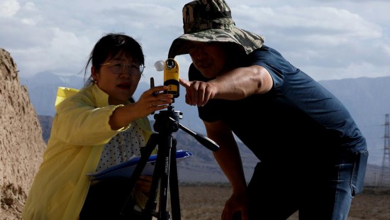 8月16日,嘉峪关丝路(长城)文化研究院长城保护研究所所长张斌(右)和同事在嘉峪关长城第二墩附近使用风速仪监测风速。新华社记者张智敏 摄