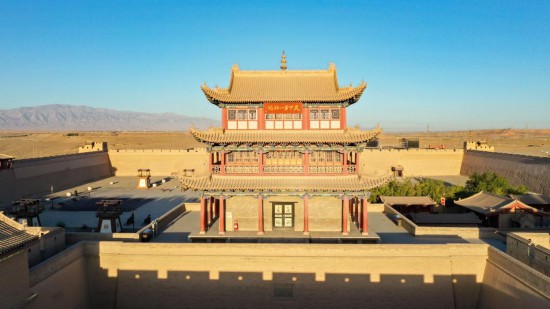 清晨,阳光渐次照亮位于甘肃省河西走廊西端的嘉峪关,矗立在大漠戈壁之上的古建楼阁沐浴着金光,显得格外壮美。