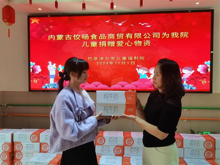 11月1日,一辆货车缓缓驶入市儿童福利院,内蒙古佼旸食品商贸有限公司的工作人员将100箱包装精美的牛奶从货车上搬下,整齐地摆放在市儿童福利院的大厅内。