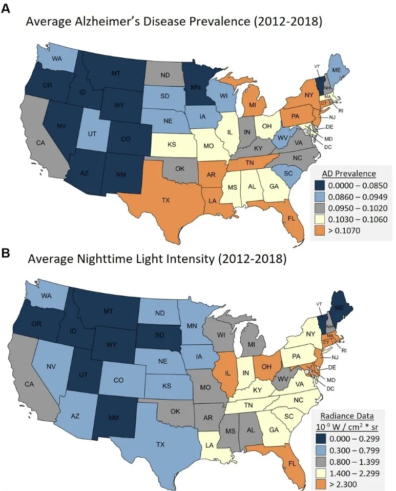 这项研究的科研人员把美国48个州的光污染情况和本地区的医疗记录进行了比对,令人惊讶的是,他们竟然发现光污染和阿尔茨海默病之间存在显著正相关,这种巧合也引起了科研人员的兴趣。