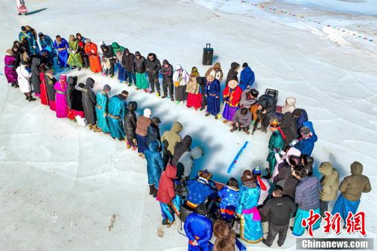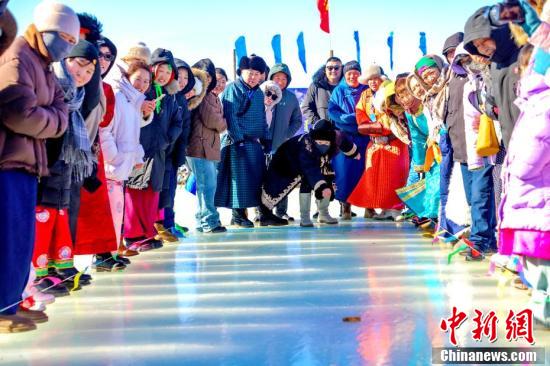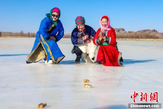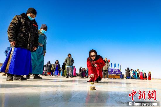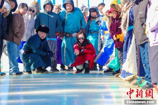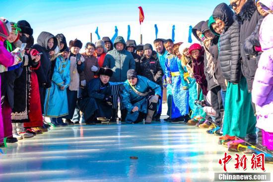 “冰上阿日嘎”是蒙古族传统的冰上体育运动,2007年被列入第一批内蒙古自治区级非物质文化遗产代表性项目名录。“阿日嘎”是特指经过加工修理的牛踝骨。制作时把牛踝骨凸凹两面削平,在凹面打个洞,灌进铅水以增加重量。在冰上游戏时,凸面向上抓阿日嘎,用大拇指和食指捻弹向远处,当作目标阿日嘎。另一阿日嘎,瞄准目标阿日嘎捻弹过去,击中者为胜。此游戏两个人就可进行,人多时场面会更加热烈。图为牧民参与“冰上阿日嘎”比赛。