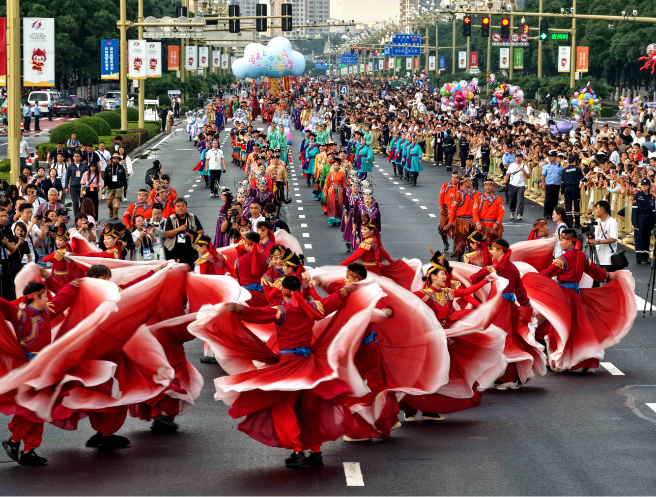 其中,巨型气模方队由3个6米高的巨型气模——内蒙古自治区第十一届少数民族传统体育运动会吉祥物“赤龙儿”、非遗造型、“周末上哪疯 一站到赤峰”云朵标志组成,12名演员牵引行进,成为嘉年华活动现场的焦点。国内民间表演方队汇聚潮汕英歌舞、陕北腰鼓等节目。彩装方队中10名仿铜雕塑艺人、56名民族服饰模特、14名游戏角色扮演者引人瞩目。压轴的30人彩带龙表演以整齐划一的动作,诠释协作与力量之美。