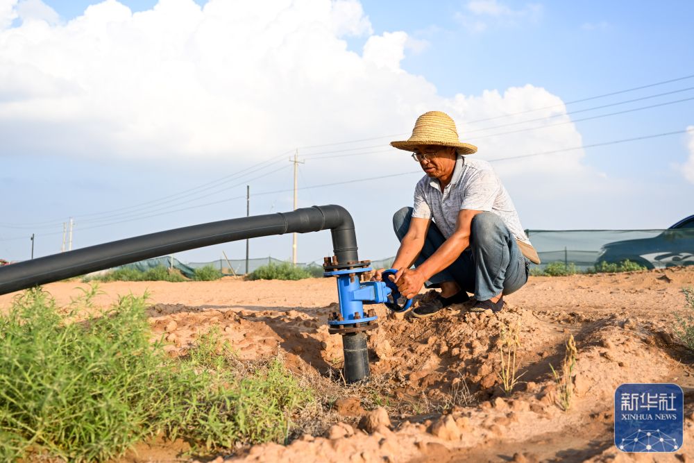 ↑工人在黄河上中游阿拉善盟乌兰布和段(阎王鼻子)阻沙入河生态修复工程项目区巡查浇灌设备(8月1日摄)。