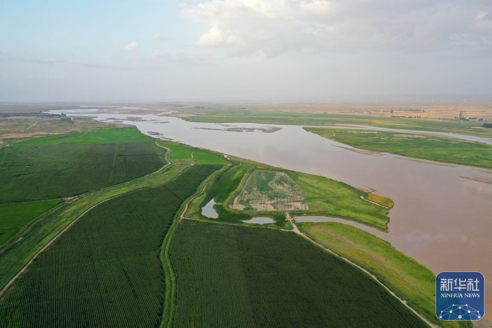 ↑这是8月1日拍摄的黄河上中游阿拉善盟乌兰布和段(阎王鼻子)阻沙入河生态修复工程项目区(无人机照片)。
