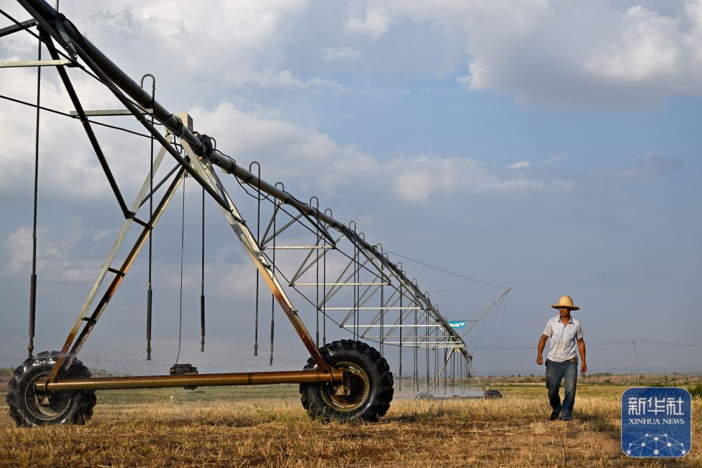 ↑工人在黄河上中游阿拉善盟乌兰布和段(阎王鼻子)阻沙入河生态修复工程项目区巡查喷灌设备(8月1日摄)。