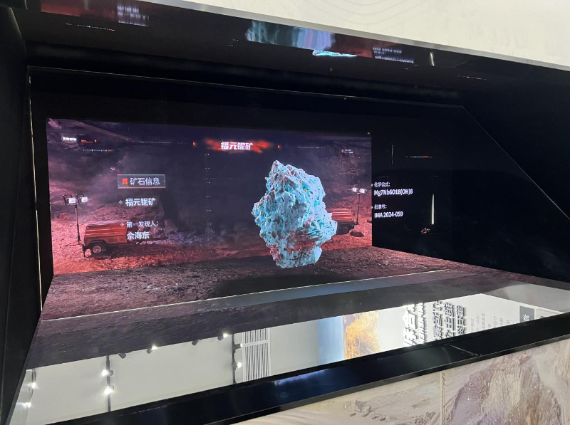 图为包钢科技商务交流中心,白云鄂博矿床发现的新矿物福元铌矿全息投影。新华网 李世纯 摄