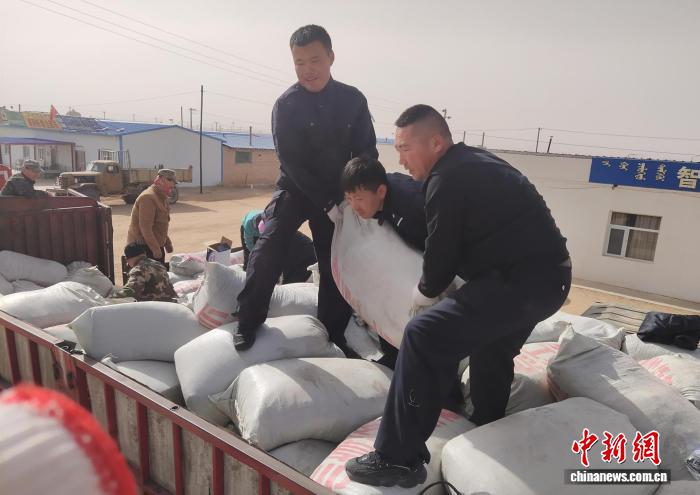 图为呼格吉勒(图右)帮助牧户装卸饲料。旷靖摄