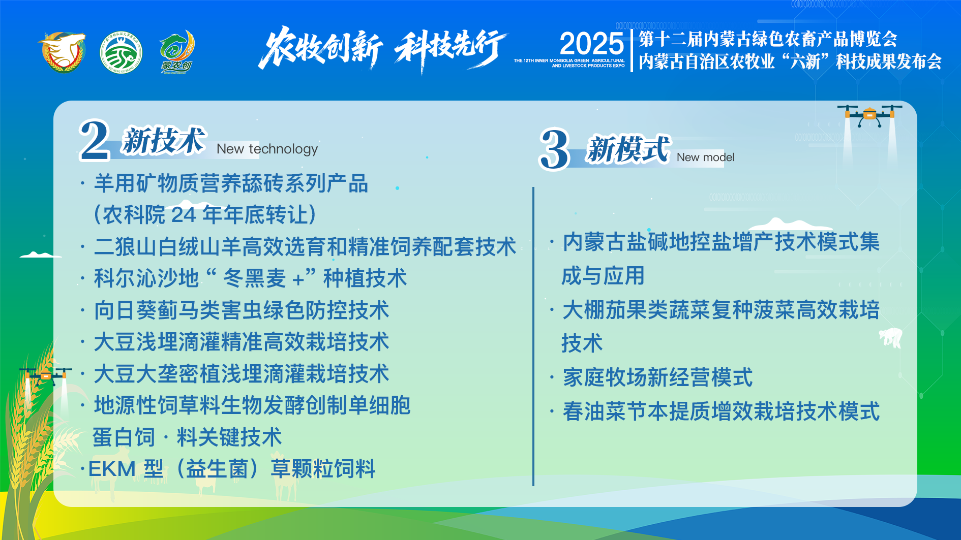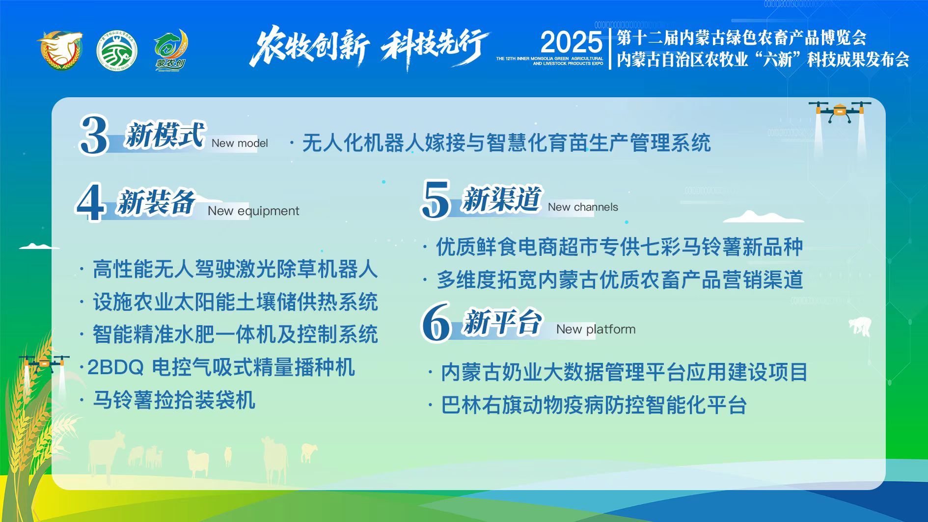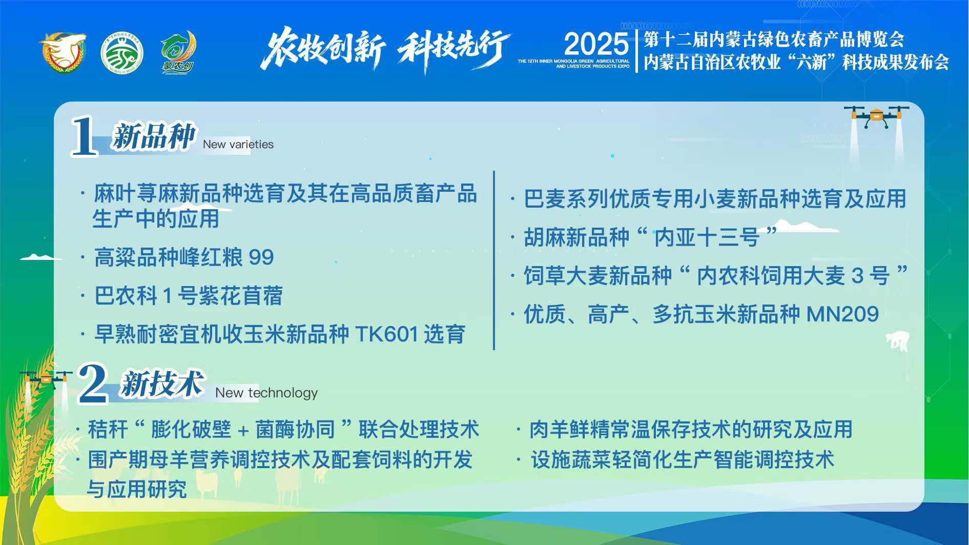 会上集中展示了经严格评选的46项科技成果,涵盖新品种20项、新技术12项、新模式5项、新装备5项、新渠道2项、新平台2项。这些成果精准瞄准内蒙古农牧业全产业链技术短板与关键环节,兼具技术先进性、实用性与良好转化前景。