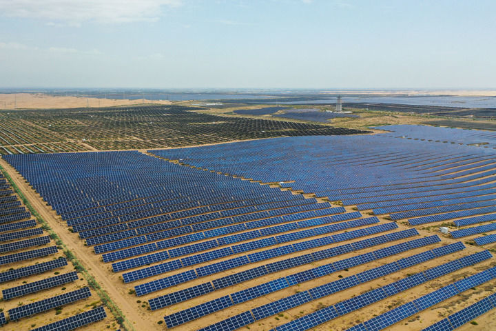 站在达拉特光伏发电应用领跑基地观景台,雄踞沙海的蓝色光伏板一望无际,光伏板下沙生植被欣欣向荣。“我们通过掺拌红泥和生物肥,改良了光伏区的土壤,为植物生长创造条件。”达拉特旗能源局工作人员杨超说。