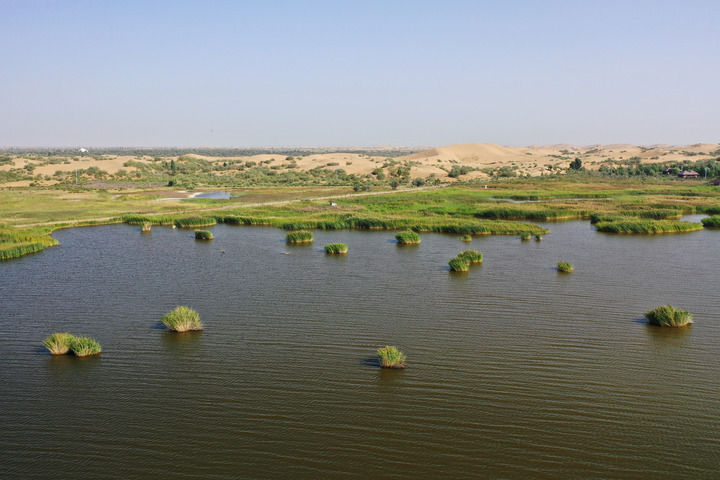 这是2025年9月3日拍摄的鄂尔多斯市杭锦旗境内库布其沙漠里的七星湖景区(无人机照片)。新华社记者 李志鹏 摄