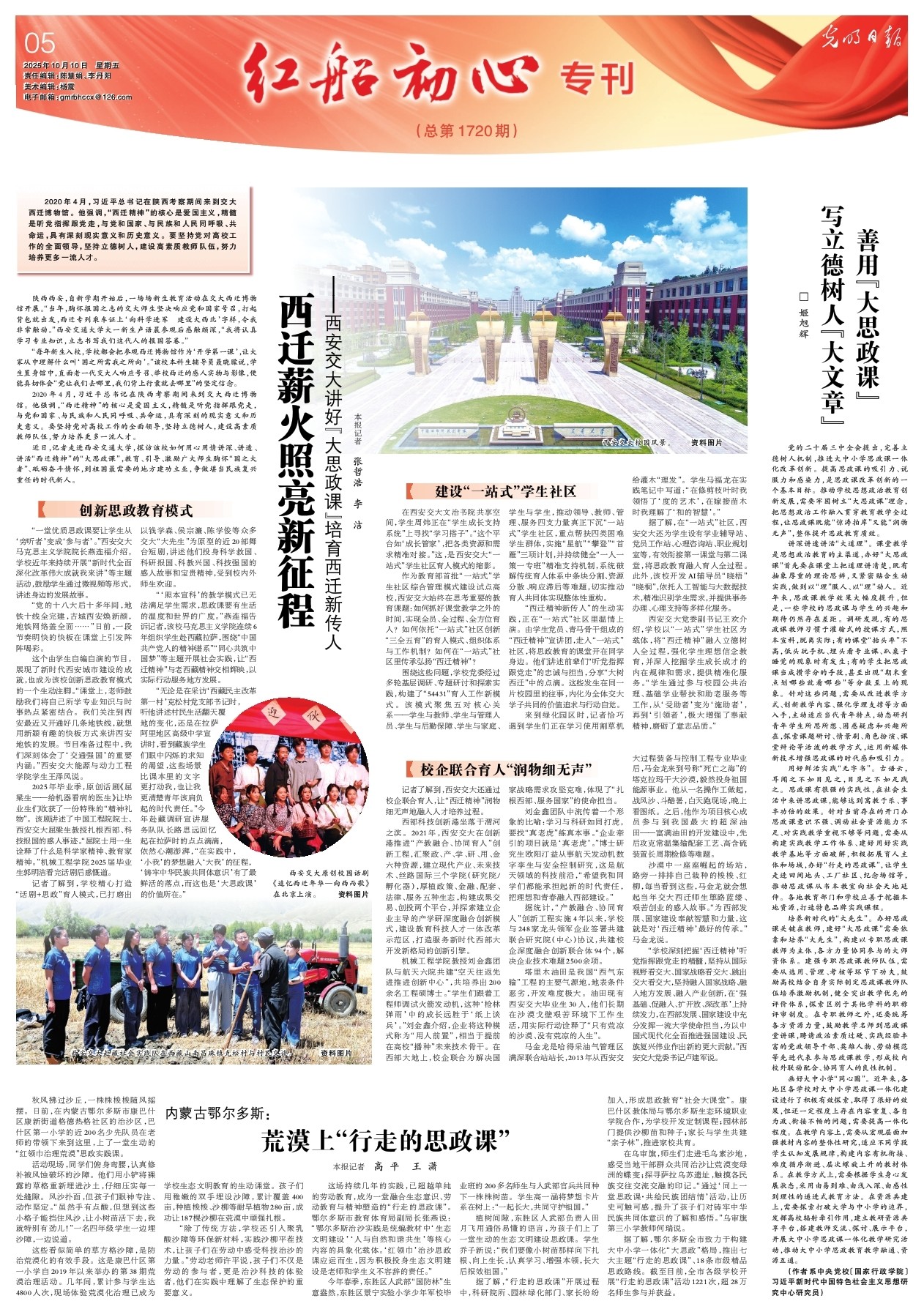 这场持续几年的实践,已超越单纯的劳动教育,成为一堂融合生态意识、劳动教育与精神塑造的“行走的思政课”。鄂尔多斯市教育体育局副局长张燕说:“鄂尔多斯治沙实践是统编教材中‘生态文明建设’‘人与自然和谐共生’等核心内容的具象化载体。‘红领巾’治沙思政课应运而生,因为积极投身生态文明建设是老师和学生义不容辞的责任。”