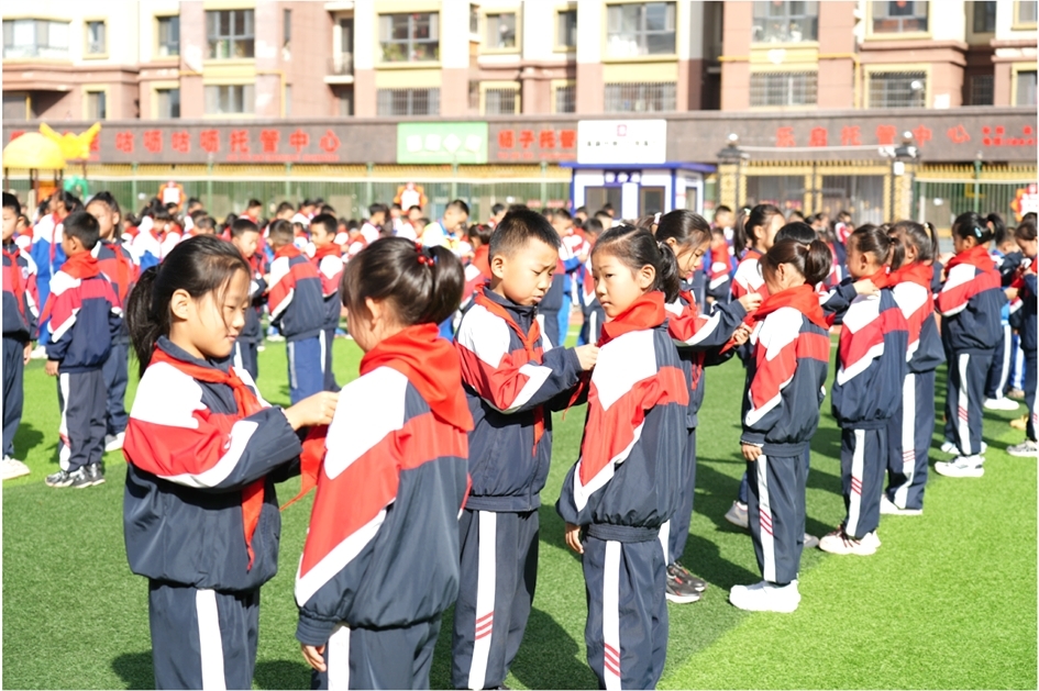 在临河区第四小学教育集团庆丰校区,168名同学正式成为中国少年先锋队队员,高年级老队员双手托举红领巾,为新队员认真佩戴。