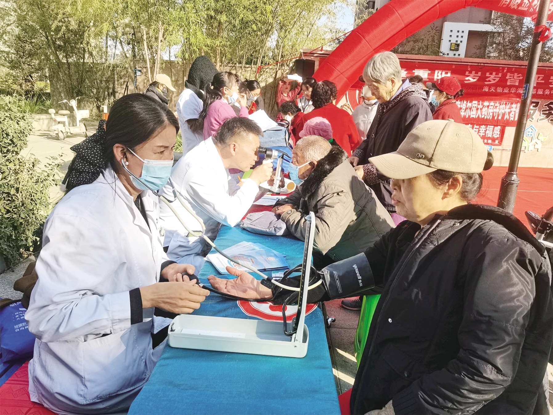 活动现场向老年人发放了《老年人诚信防骗指南》,细致讲解防骗知识;义诊台前,医护人员为老年人进行免费体检;银行工作人员现场解答金融问题。社区和物业工作人员与老年人围坐交流,认真倾听关于惠民政策、物业服务及生活难题的诉求,逐一回应解答,现场暖意融融。