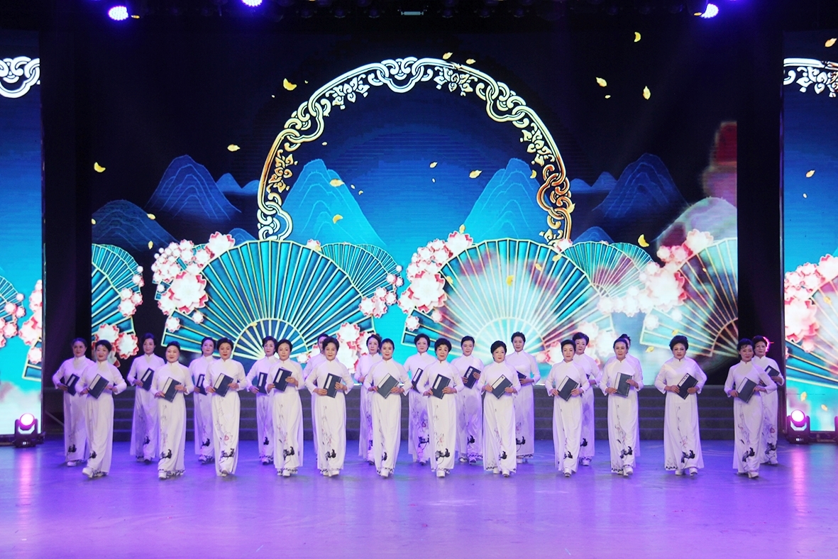 演出在器乐合奏《幸福年·喜洋洋》中拉开帷幕。随后,舞蹈《心若葵花》、二重唱《临河临河》、小品《送面》、旗袍秀《书香墨韵》等精彩节目接连上演,博得现场观众阵阵掌声。最后,演出在大合唱《重整河山待后生+没有共产党就没有新中国》中落下帷幕。