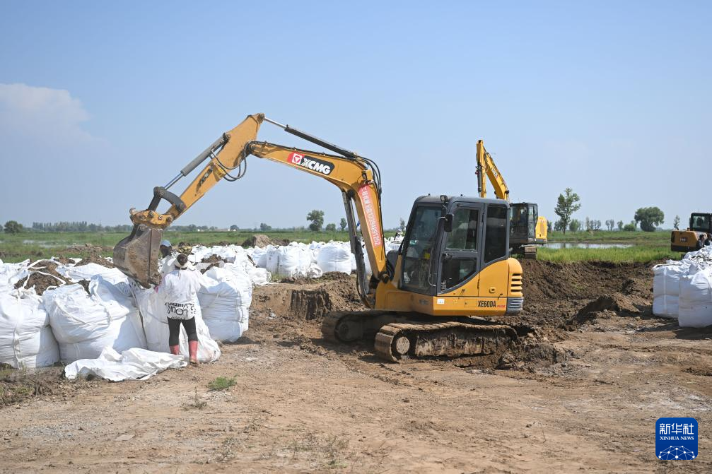 8月1日,工人在内蒙古呼和浩特市土默特左旗独立坝村外装填沙袋。