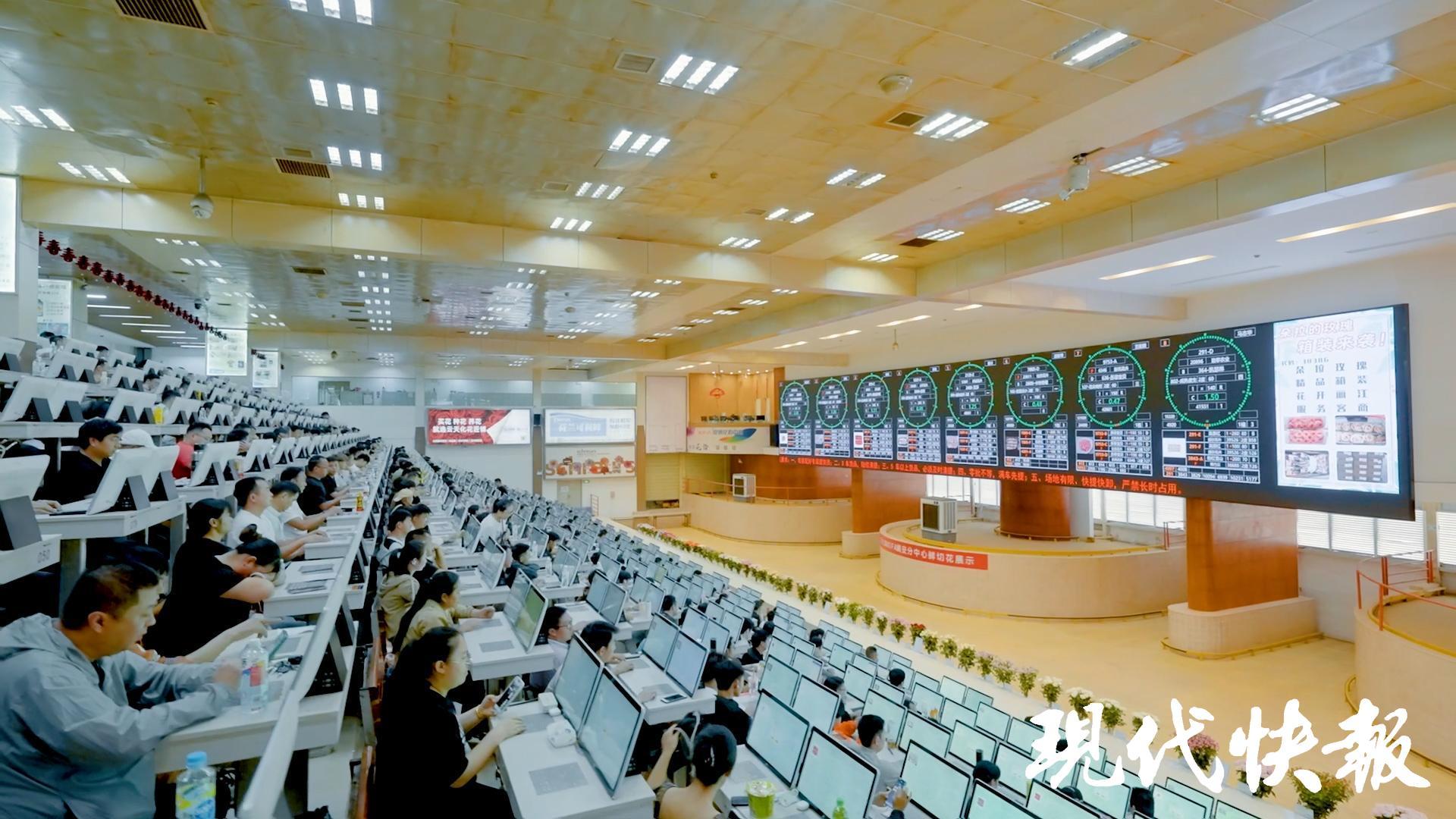 如今的昆明花拍中心,宛如股市交易大厅:12口交易大钟转动,900个交易席位座无虚席,经纪人紧盯屏幕、指尖轻点,最快0.04秒就能成交一笔,抢花像抢黄金般紧张。这里的鲜花交易价格指数如同股市指数,引领着全国鲜花的零售价格。