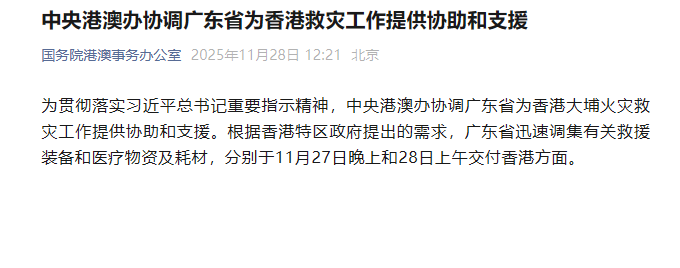 为贯彻落实习近平总书记重要指示精神,中央港澳办协调广东省为香港大埔火灾救灾工作提供协助和支援。根据香港特区政府提出的需求,广东省迅速调集有关救援装备和医疗物资及耗材,分别于11月27日晚上和28日上午交付香港方面。