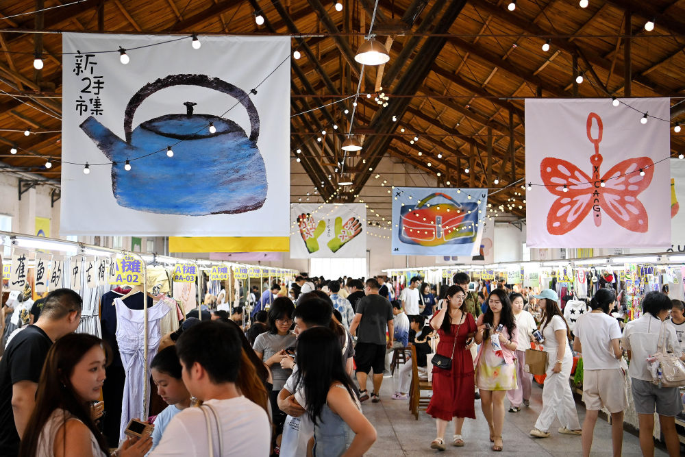 2025年7月5日,游客在西安西仓市集文创公园内的“新二手市集”上参观游览。2024年以来,西安对西仓区域实施“微更新、轻改造”,在保留核心区传统集市风貌的基础上,升级改造原有设施,建设西仓市集文创公园,打造“复合型文化消费新场景”;通过引入创新业态、开设“新二手市集”等方式,让咖啡潮玩、非遗体验、城市记忆展览等年轻化元素与市井烟火相融共生,使老城核心区在“微更新”中持续焕发新活力。
