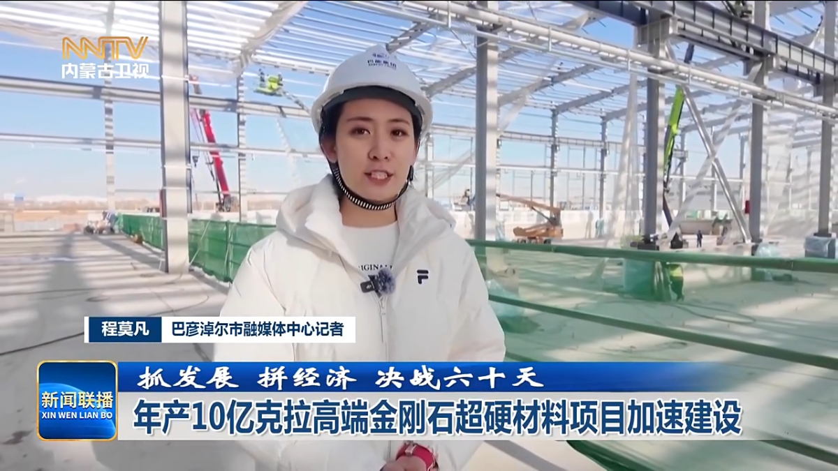 程莫凡 巴彦淖尔市融媒体中心记者 我现在是在位于巴彦淖尔经济技术开发区年产10亿克拉高品质金刚石超硬材料项目建设现场,现场机器设备轰鸣,60多名建设者同时作业,确保项目如期建成。